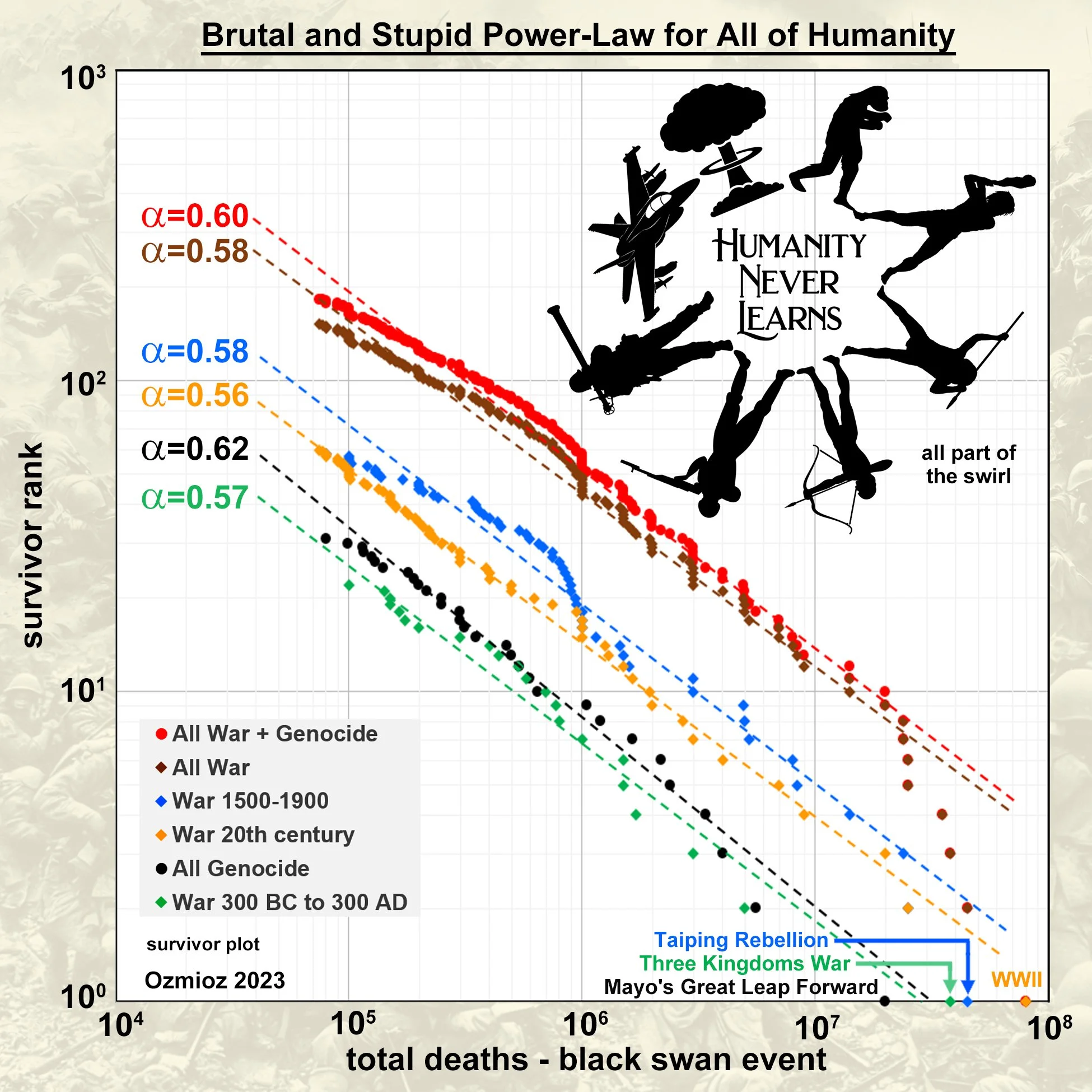 During our intellectual wanderings during Covid we stumbled upon the data analysis fact that war and genocide have the same statistics as earthquakes if you equate number of deaths as earthquake energy (see figure).