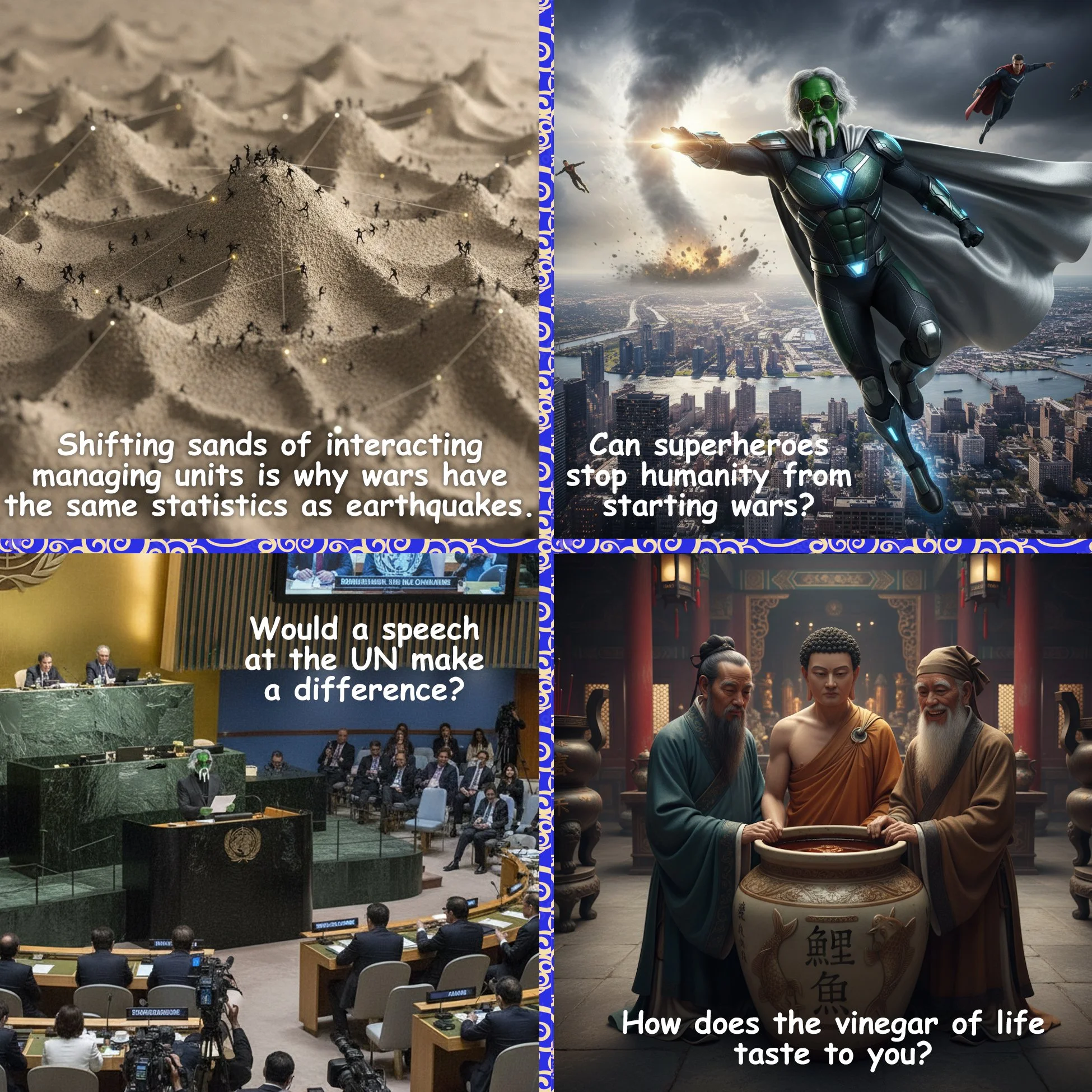 We sat there quietly as our multiple personalities began arguing inside our head. One argument was, “Do you know how many people die in superhero movies? The last thing humanity needs is a superhero. Maybe we could give a speech on the floor of the UN. Wait, that’s not going to work either. Most leaders are egomaniacs. Appealing to reason amongst a group of egomaniacs is a fool’s mission.”